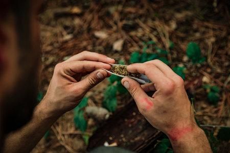Close-up of a hand rolling a marijuana cigarette in a forest