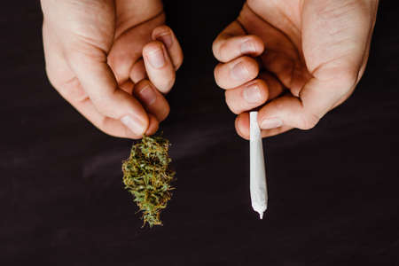 On a black background. top view Cannabis bud and joint in the hands of a man. The concept of marijuana use.