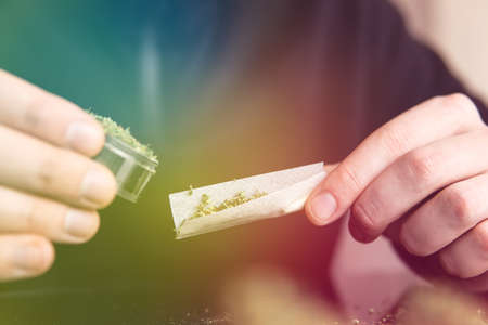 Preparing and Rolling Marijuana Cannabis Joint. Drugs Narcotic Concept. Close up.