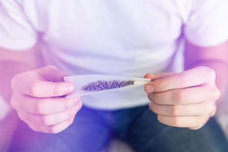 Close-up of the hands of a man in a sweatshirt rolling a marijuana cigarette with thc outdoors. Legal drug use.