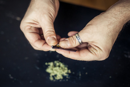 Close up of a mans hands rolling up a marijuana joint.