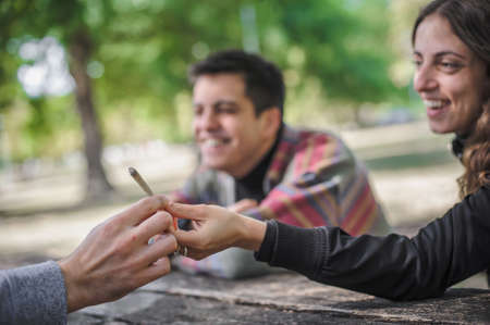 Passing cannabis cigarette from hand to hand. Cannabis smoking concept. pastel color photo of Hands giving each other smoldering paper cigarette.