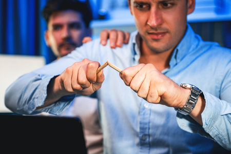 Stressful burnout of businessman destroying pencil for venting emotion in overwork load at night time, supported by business partner to solve issue problem at neon light of workplace. Sellable.