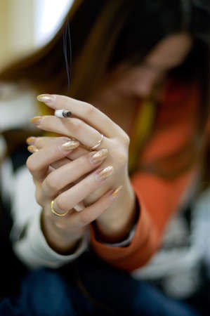 The girl is smoking a cigarette. Female hands hold a lighter.
