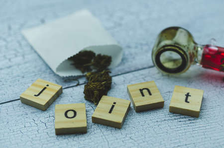 Marijuana cones in a white paper pharmacy bag against a glass Smoking pipe. Wooden cubes with the word JOINT