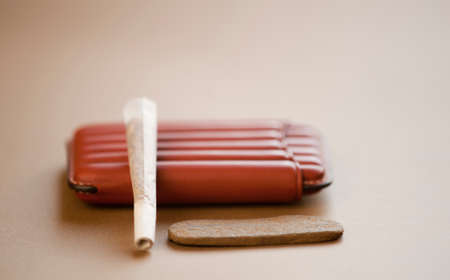 Medical Hashish in the Kingdom of Morocco - CBD medical Moroccan cannabis hashish, tobacco pack with cigar prepared on light brown background