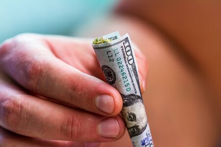 close up of stuffing and rolling a fake one hundred dollar bill cannabis joint