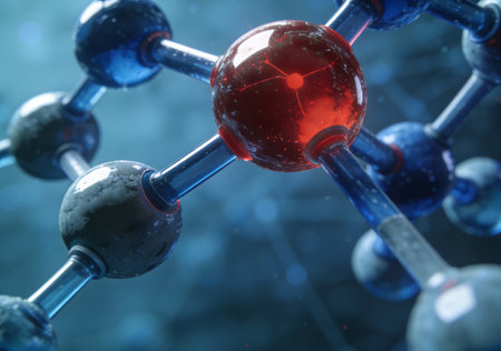 This abstract image captures the intricate beauty of a molecular structure with glass-like spheres, reflecting colorful shades in a modern design.