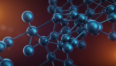 A stunning abstract visualization depicting molecular structures with radiant atoms and connections, blending science and technology in a vibrant blue and orange palette.