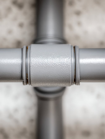 Close-up of a textured gray metal pipe connection, revealing rust patches and surface details, set against a softly blurred background.