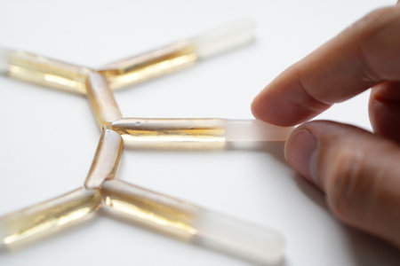 Molecule structure with golden liquid. Finger assembling transparent bars. White tabletop.