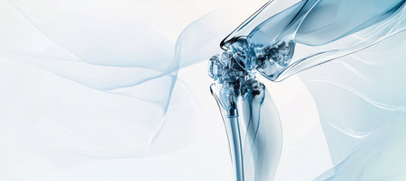 Innovative knee endoprosthesis displayed in a semi-transparent exploded view, internal components. the gradient background shifts from blue to white, adding a modern and professional touch suitable for medical education and design.