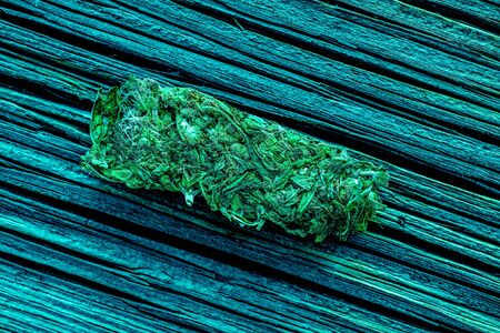 colorful light on dry cut green cannabis hemp leaves ready to use for rest and pleasure. Macro detail of single cannabis bud (mangolope marijuana strain) over wooden dark background