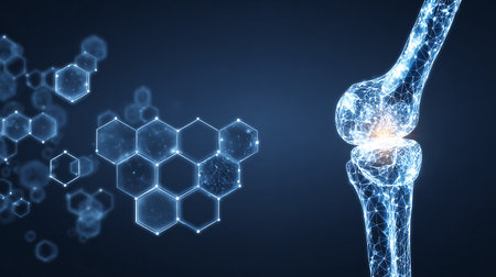 Viral infection affecting human knee joint with glowing virus particles and transparent bone structure in medical concept