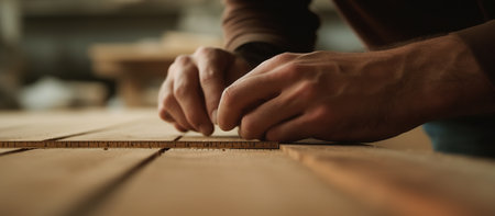 Generative AI : hands of a master carpenter measure distance with a pencil and a tape measure