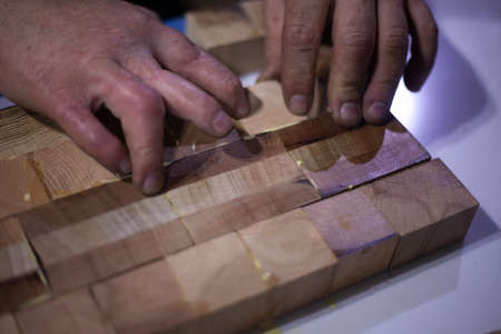 Bonding wood in the workshop. The use of glue for different types of wood. Making worktops for the kitchen. The husband spends time on carpentry. Work as a craftsman. Creating a cutting board design.