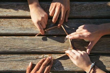 From above crop shot of five hands touching sunglasses that lie on wooden table in sun light.