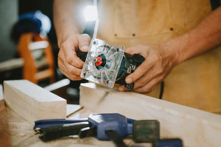 Carpenter use Router Trimmer to remove the material and to cut out the patch on wood at workshop,DIY maker and woodworking concept. selective focus