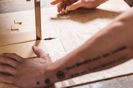 Carpenter is screwing nut, DIY woodworking, Close up.