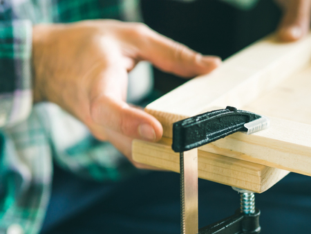 Hands of carpenter screwing a glue clamp to join wooden planks together