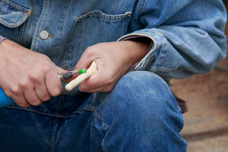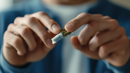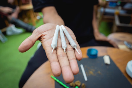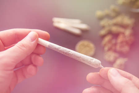 Close-up of the hands of a man in a sweatshirt rolling a marijuana cigarette with thc outdoors. Legal drug use.