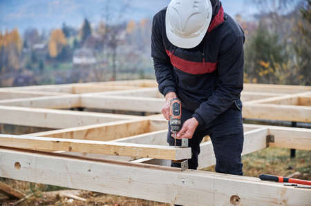 Man worker building wooden frame house on pile foundation. Carpenter installing furniture for wooden truss, using hammer and screwdriver. Carpentry concept.