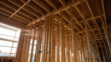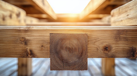 Intricate woodwork showcasing beams and joinery in a sunlit construction setting. Generative AI