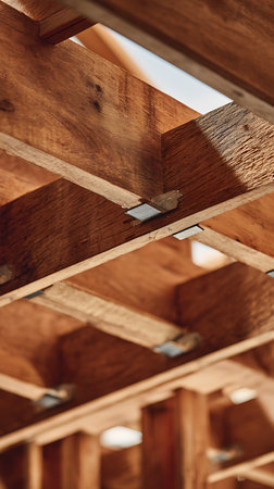 Captivating low-angle shot showcasing exposed wooden ceiling beams with visible metal connectors in a residential construction site, revealing structural framework.