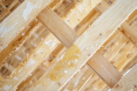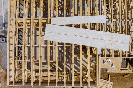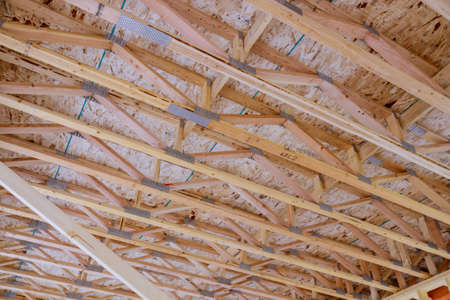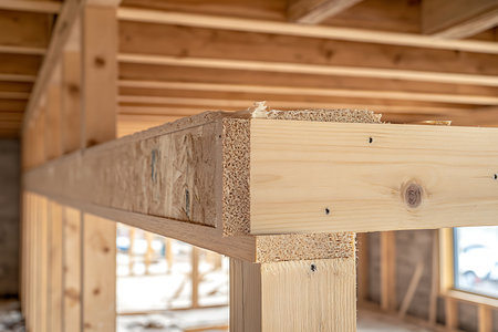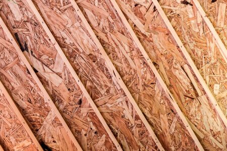 Close-up capturing an in-progress home build highlighting the structural wooden beams and oriented strand board, showing the exposed edges and fastening methods.