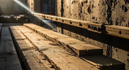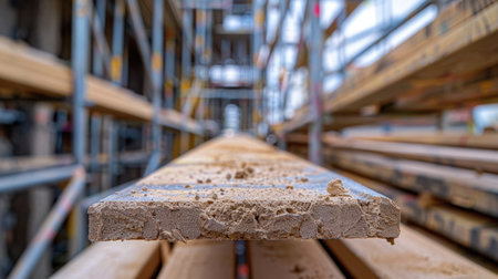 This detailed close-up image showcases a wood plank covered in dust, emphasizing the construction environment with scaffolding and wooden beams visible in the background.
