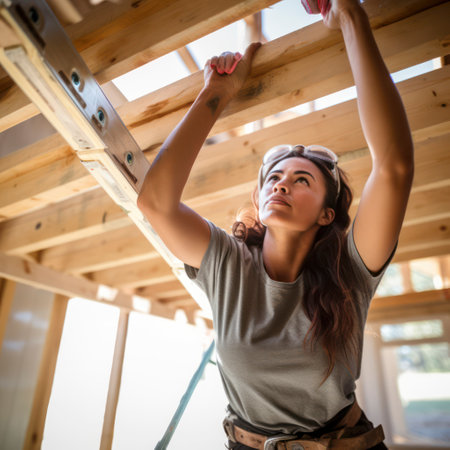 woman carpenter putting up joist in home construction.