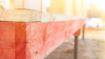 Red wooden beams and unprocessed boards at construction site closeup. Assemble of new summerhouse of clean materials. Traditions and innovations