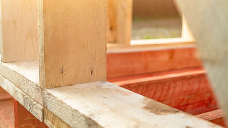 Carcass of wooden beams at cottage construction site on sunny day closeup. Old tradition of building at rural site. organic materials. industrial process