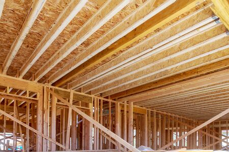 Wooden house in American beams the view of building frame structure on a new development framing of under construction