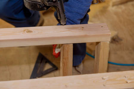 Workmen using pneumatic nail gun install wood framing beams on new home under construction