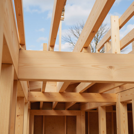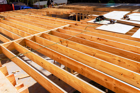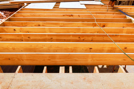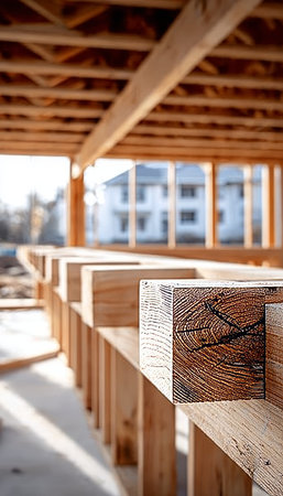 Construction Scene Featuring Robust House Joists in Timber Frame Building with Outdoor View