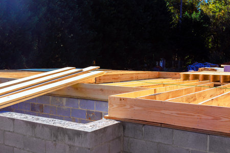 Installation work wood floor joist trusses layout on concrete block foundation new custom home