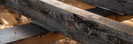A detailed close-up view of exposed wood beams in an unfinished attic space, showcasing insulation material and rustic textures, perfect for renovation themes.