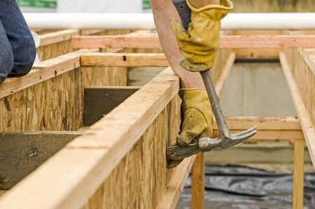 Man worker building wooden frame house on pile foundation. Carpenter hammering nail into wooden truss, using hammer. Carpentry concept.