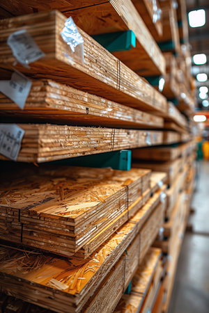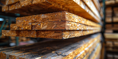 Wooden planks stacked in a warehouse, closeup of photo