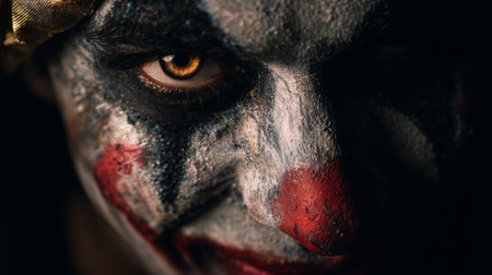 A detailed shot of a clowns face against a dark backdrop, embodying a sense of mystery and theatrics