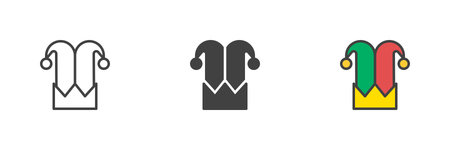 Jester hat medieval entertainment different style icon set. Line, filled outline and solid color vector icon. Fool symbol, carnival sign, theater icon.