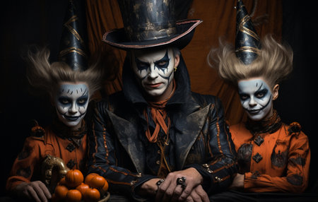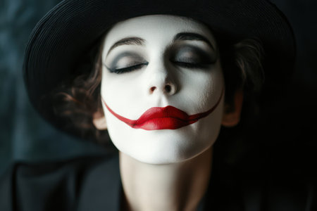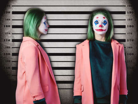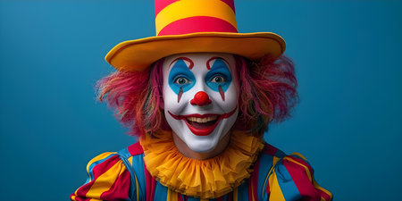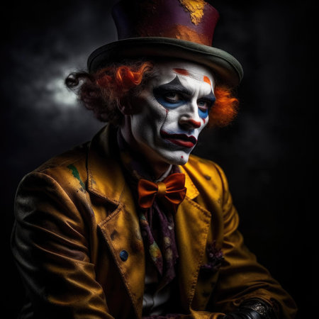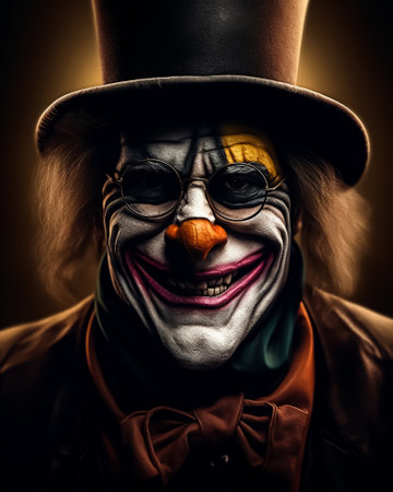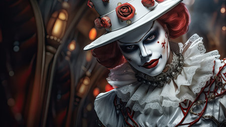 Makeup scary clown for a fun holiday model on a dark background in the studio.