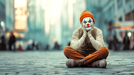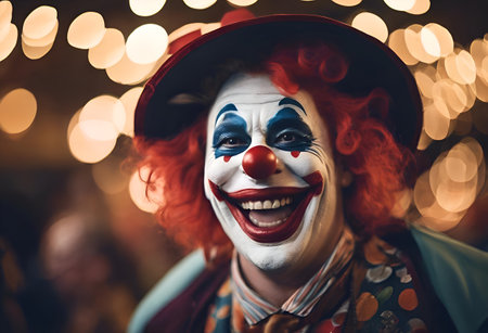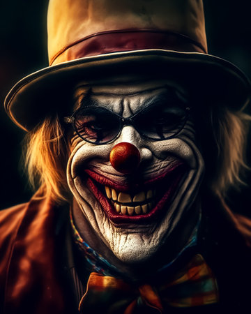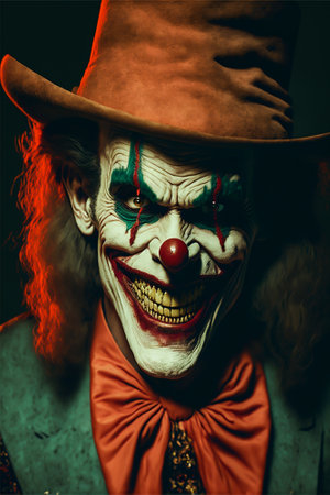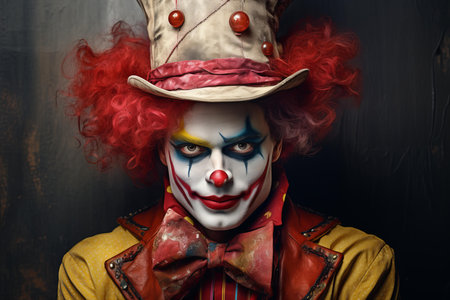 Halloween. Portrait of a bloodthirsty clown man over dark brick wall. Male zombie clown. Horror, thriller film.