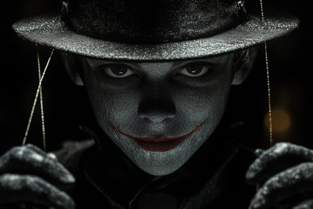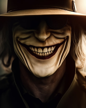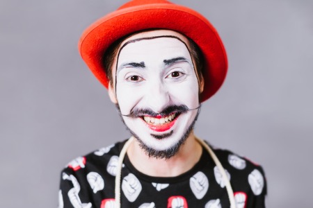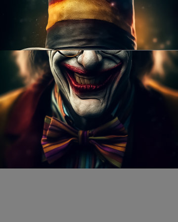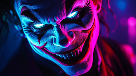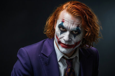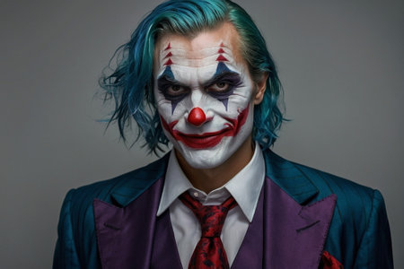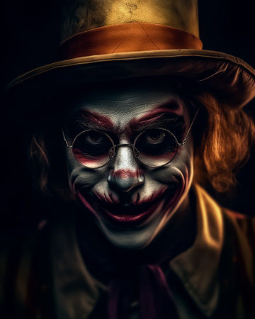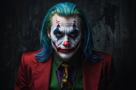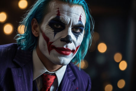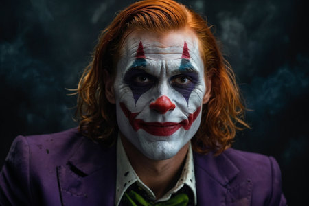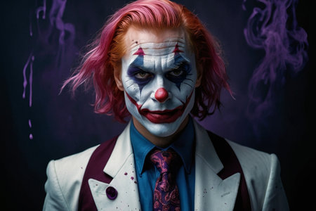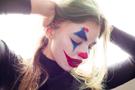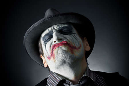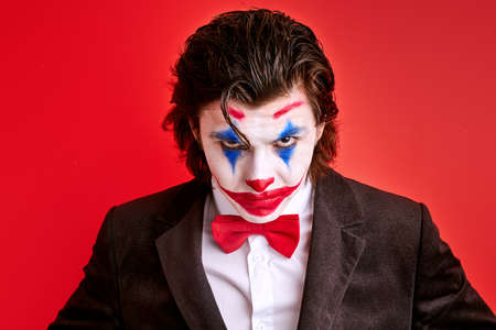 Close-up portrait of a joker man. Stock photo makeup joker in a horror room.