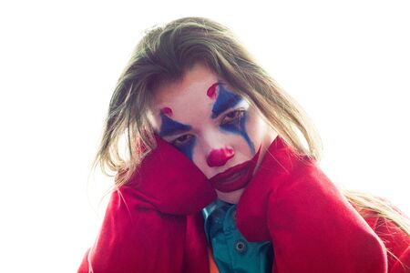 KAZAKHSTAN, KOSTANAY - OCTOBER 21, 2019: Portrait of a girl with Joker makeup isolated on white background.