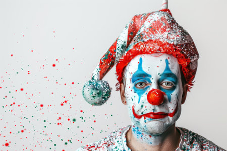 Clown concept - Make-up artist applying paint on the man clown in the dressing room