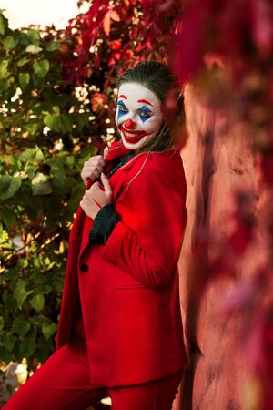 Makeup for Halloween: a girl in the image of a man in the makeup of the Joker