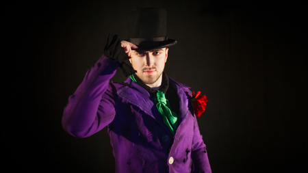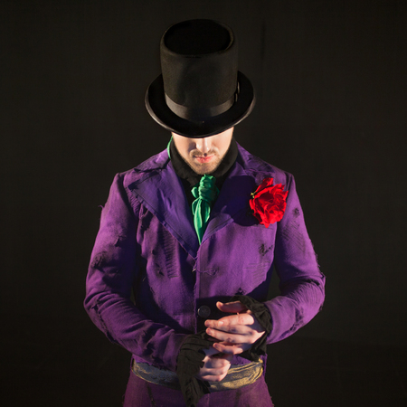 Showman. Young male entertainer, presenter or actor on stage. The guy in the purple camisole and the cylinder. Bright tailcoat, suit