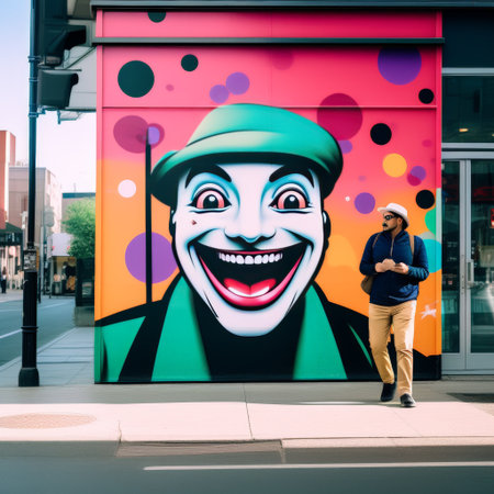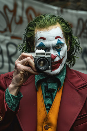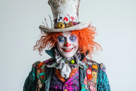 Man in mime makeup cosplay with green hair and a red suit an orange tie and a green shirt. Clown smiles